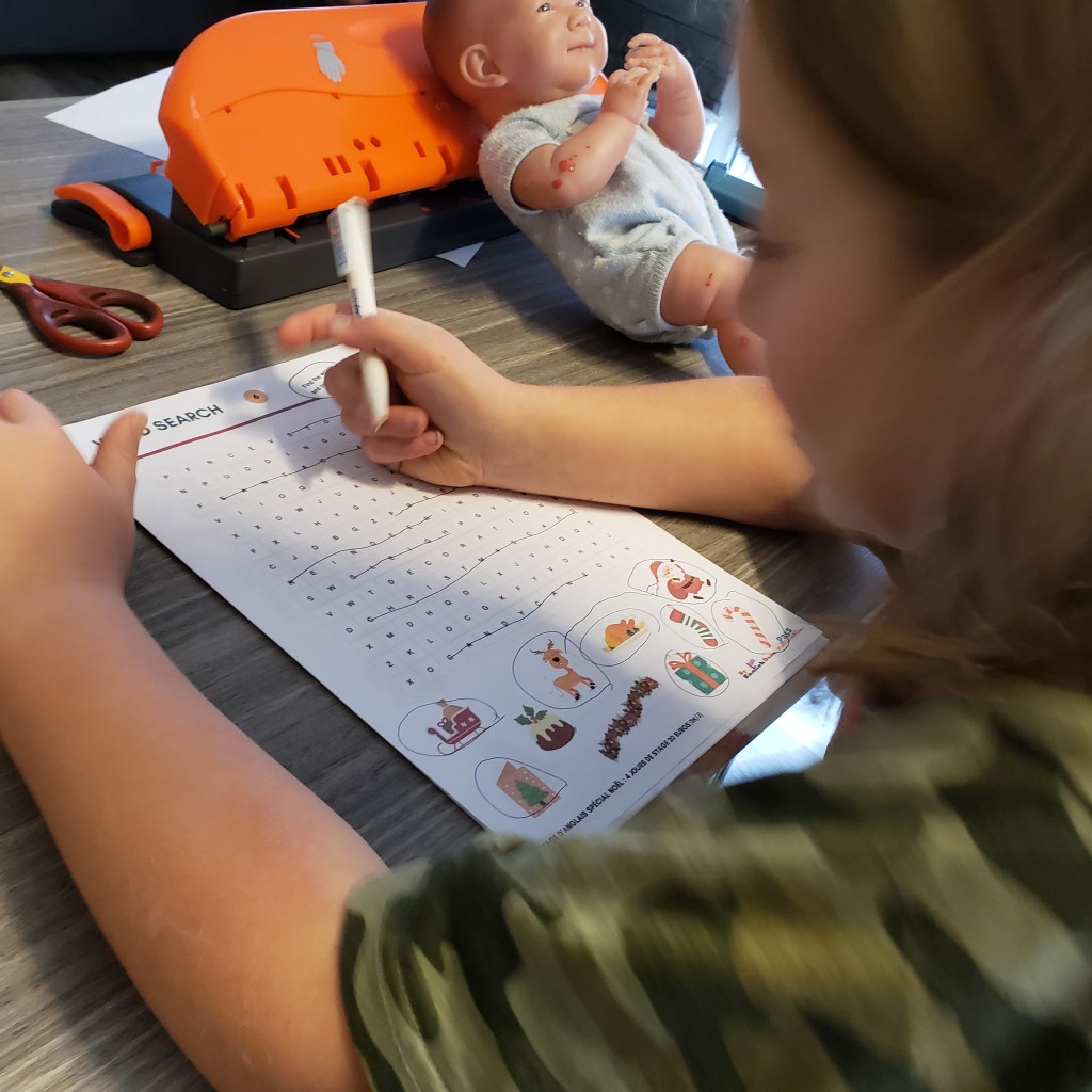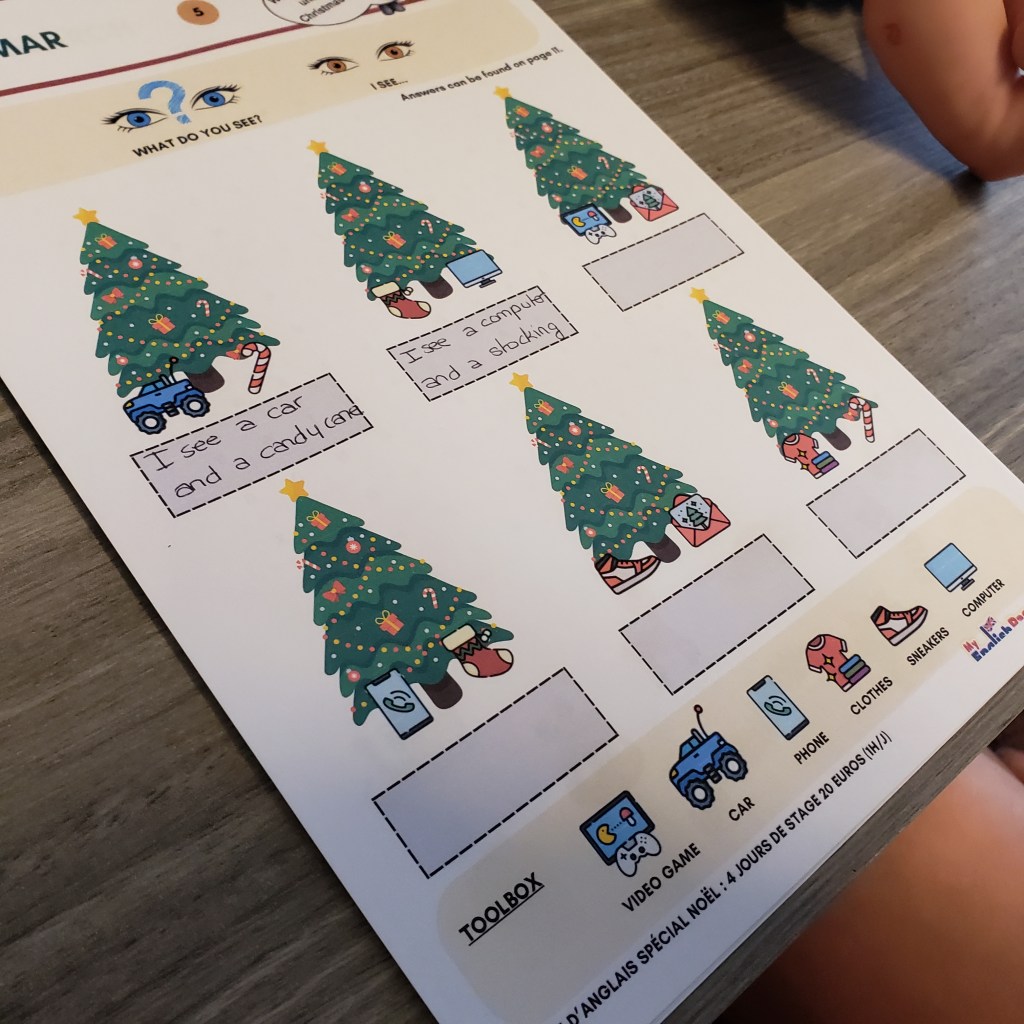 Cette répétition du début de phrase est intéressante puisqu’elle pourra tout à fait être réutilisée dans d’autres circonstances et dans le quotidien. On retrouve également un jeu de mots mêlés ! L’un des jeux préférés d’Antonin. Petit plus vraiment sympa et qu’il a adoré : les mots à chercher dans la grille ne sont pas écrits ; Ce sont des images et il faut donc d’abord se souvenir du mot ou chercher dans la liste de vocabulaire en début de fichier. Ici, il a essayé de se souvenir de certains, et a été piocher dans la petite liste pour ceux dont il ne se souvenait pas. L’enfant peut donc gérer en toute autonomie et se corriger si besoin. C’est gratifiant pour lui de ne pas avoir besoin de demander à un adulte mais de pouvoir faire par lui-même. Mais il a vraiment beaucoup aimé, et il était bien content de se rendre compte qu’il se souvenait de certains mots de vocabulaire. Il les réemploie d’ailleurs depuis en désignant notre sapin de Noël, les sucres d’orge en décoration que l’on a mis dehors, ou encore les cartes de Noël qu’il veut écrire. L’objectif est donc atteint !