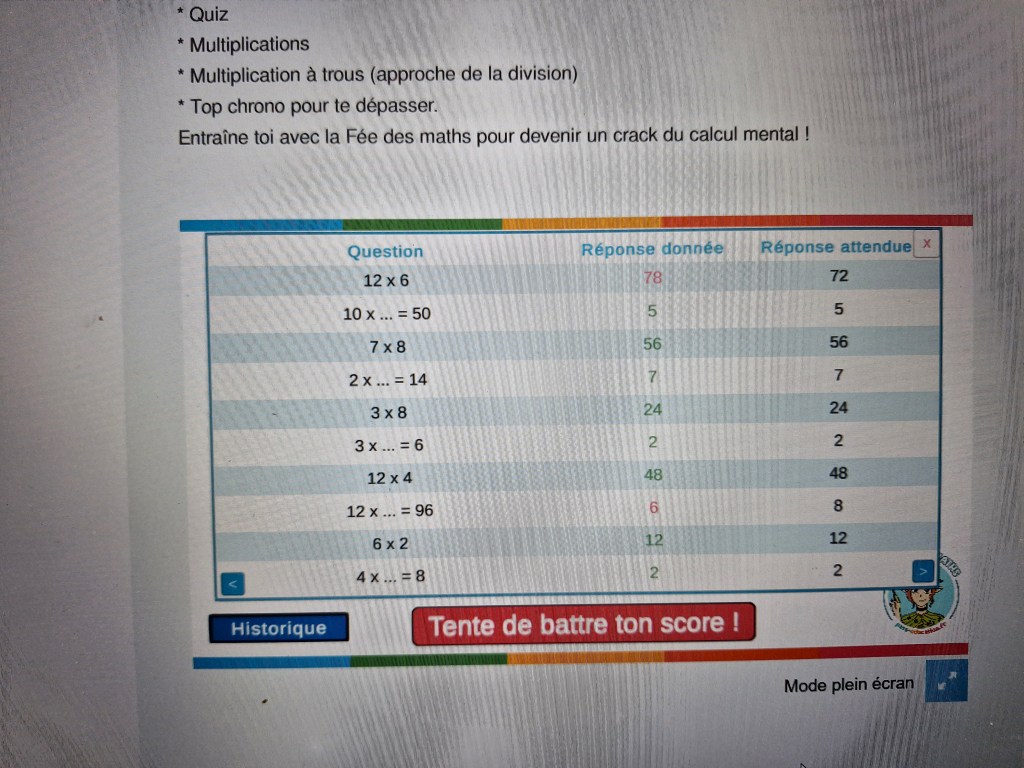 Des opérations dont il faut trouver la réponse (en mode multiplication normale, ou multiplications à trous). Mais cette fois-ci, il faut être le plus rapide possible. Point positif : En fin de jeu, un tableau récapitulatif permet à l’enfant de voir ses réponses et de voir la correction s’il a fait des erreurs.
