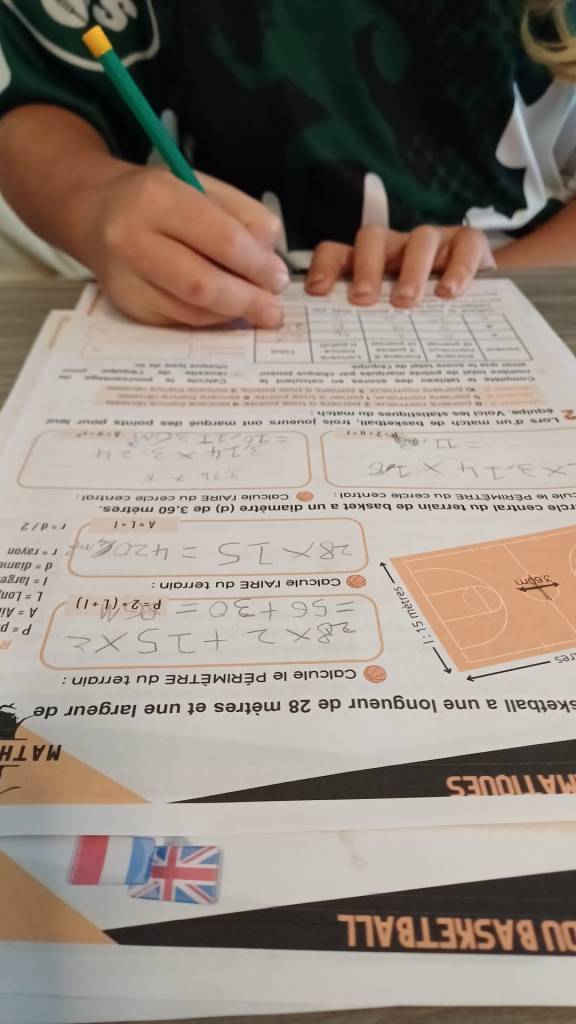 Pour la partie « mathématiques » : (une des raisons qui a fait qu’on a privilégié le cahier d’activités 6/5ème, ses facilités en maths). Des problèmes avec comme notion à travailler : aire/périmètre d’un rectangle, d’un cercle. Oui, mais ça passe tout de suite mieux quand il s’agit d’un terrain de basket ! Des pourcentages aussi… On n’avait pas encore vu ; c’était l’occasion pour nous de parler pourcentages et d’aborder la notion.